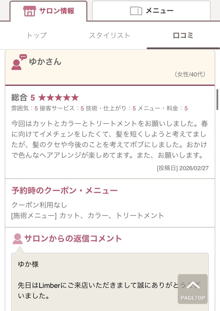 口コミ評点 雰囲気 5 技術・仕上がり 5接客サービス 5 メニュー・料金 5